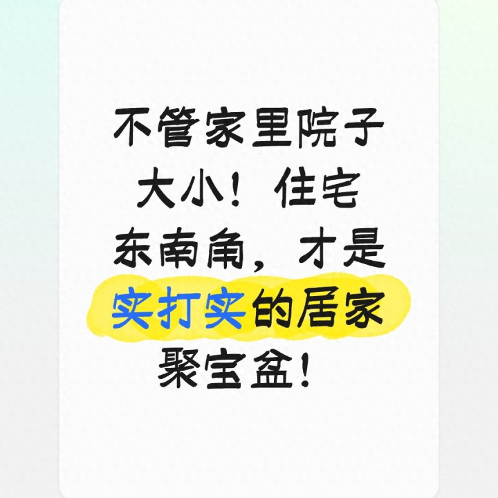 从古于今流传下来的居家活命训戒,从来都不是难解的玄学,全部贴合当然采光、室内透风、日常居住逻辑。岂论你是农村自建大院、世俗平房小院,一经城市高层楼房、小户型住宅,东南角都是整套户型中枢位置。