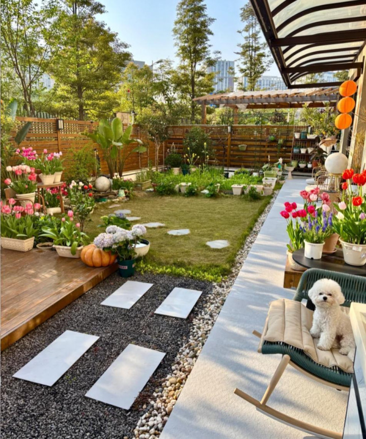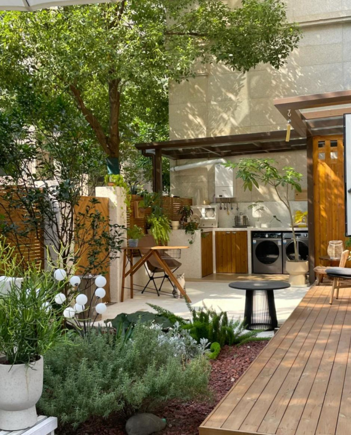 我搬进来之后,沿着墙根种了月季、绣球,边缘摆上一组户外桌椅,周末泡壶茶、望望书,或者约一又友来烧烤聊天,那种裁减和安宁,是高楼阳台给不了的。