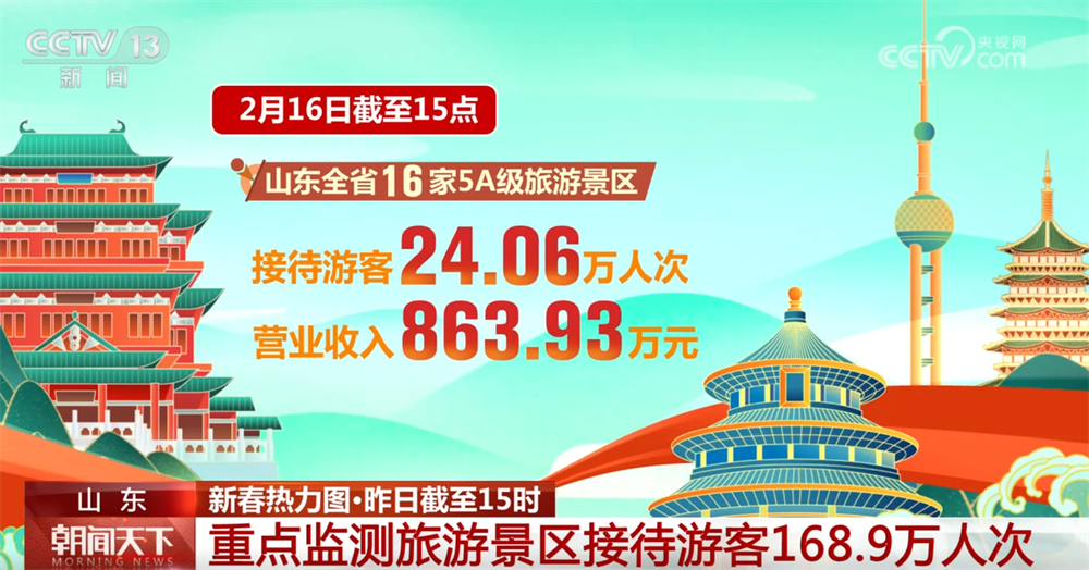 在山东,16日为止15点,星空app全省重心监测的200家旅游景区共接待旅客168.9万东说念主次,买卖收入8973.5万元,与客岁大除夕比拟,辩认增长11.1%和10.3%。