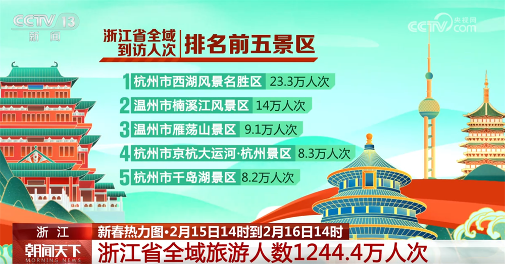 浙江:2月15日14时到2月16日14时 浙江省全域旅游东说念主数1244.4万东说念主次