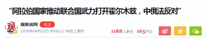 不雅察者网《“阿拉伯国度鼓舞引诱国武力洞开霍尔木兹,中俄法反对”》发布时代:2026.4.3